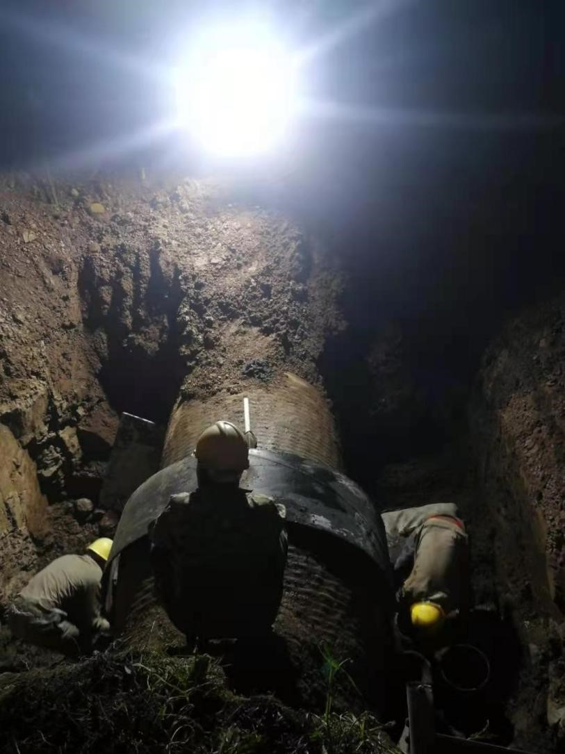 2021年5月2日凌晨3:00,經(jīng)過48小時的前期準(zhǔn)備及近5個小時的精心施工,漳河鎮(zhèn)大栗樹段DN1200源水管線順利完成搶口。目前城區(qū)供水已經(jīng)恢復(fù)正常。