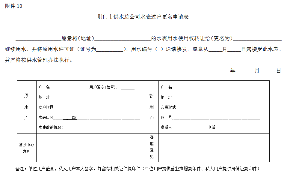 10.《荊門市供水總公司水表過戶更名申請(qǐng)表》
