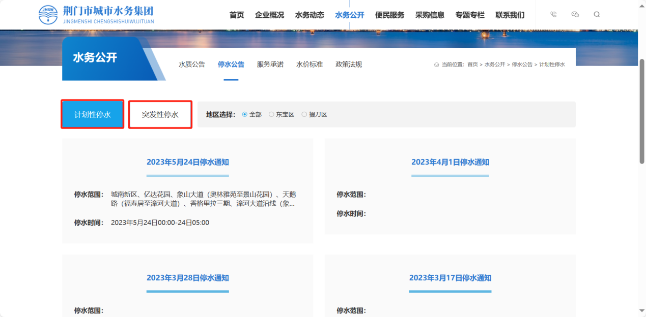 查看“計(jì)劃性停水”、“突發(fā)性停水”信息,值得一提的是,通過(guò)“地區(qū)選擇”查找會(huì)更方便哦!