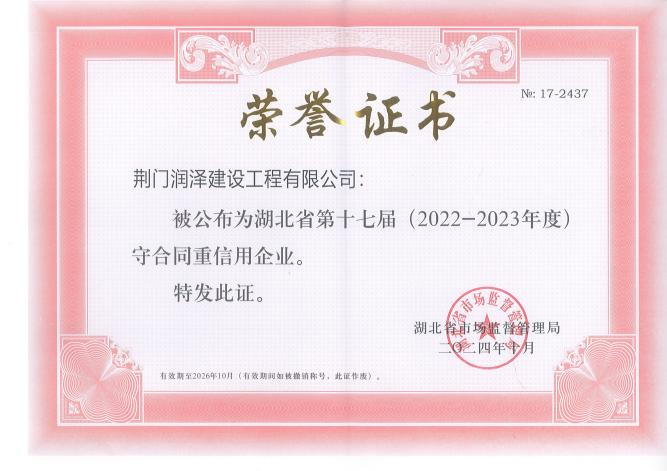 憑著“誠信為本、質(zhì)量為根”的堅守,潤澤公司連續(xù)兩年獲評荊門市和湖北省(2022-2023年度)“守合同重信用企業(yè)”,市場競爭力和品牌影響力持續(xù)攀升。