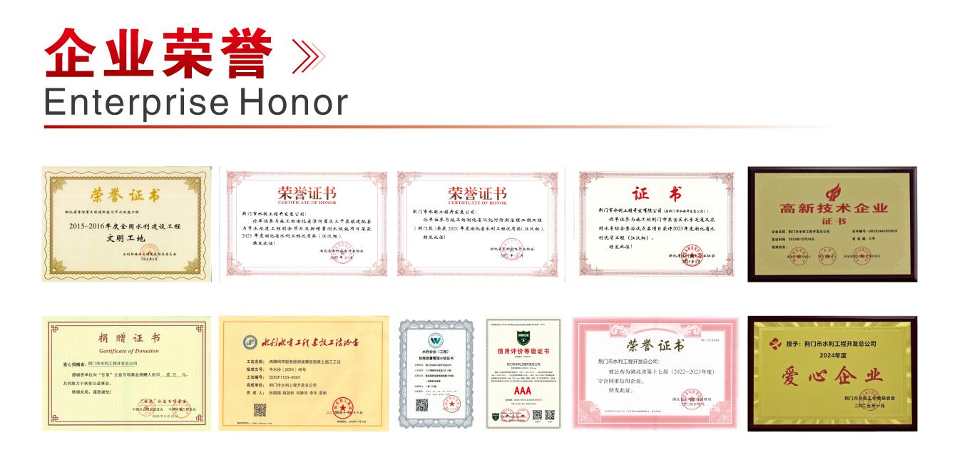 連續(xù)十五年獲評省市級“守合同 重信用”單位的榮譽(yù)稱號,連續(xù)十三年榮獲ISO三體系認(rèn)證證書,連續(xù)五年榮獲水利部頒發(fā)的全國水利建設(shè)市場主體信用等級AAA級證書。先后被國家、省、市主管部門授予全國企業(yè)征信系統(tǒng)立信單位、省市水利系統(tǒng)先進(jìn)施工企業(yè)、先進(jìn)基層黨組織、安全生產(chǎn)先進(jìn)單位等榮譽(yù)稱號。
