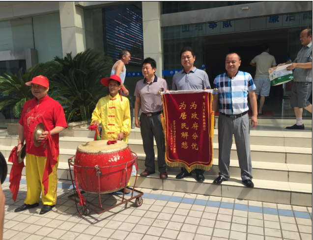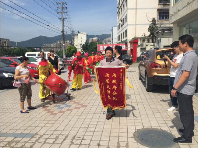 7月31日,虎牙關(guān)社區(qū)和用戶代表組織腰鼓隊(duì)到總公司送錦旗致謝。據(jù)悉,掇刀城南新區(qū)金苑大市場(chǎng)主、分水管網(wǎng)嚴(yán)重老化,水管破損而致停水。市供水總公司客服部門快速勘測(cè)報(bào)裝,維修處迅速組織施工,并調(diào)派應(yīng)急供水車在改造期間為商戶送水。
