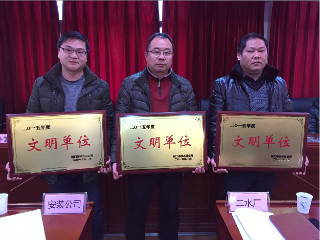 陳總經(jīng)理在講話中回顧:2015年全年制水量5022.25萬立方米,同比下降5.64%,營抄水量3784.39萬立方米,同比增長2.27%;售水收入6324.92萬元,同比增長1.33%,產(chǎn)銷差率下降至23.48%。全年完成主業(yè)產(chǎn)值1.34億元、輔業(yè)產(chǎn)值1.24億元,總產(chǎn)值2.58億元,再創(chuàng)歷史新高,實現(xiàn)量增質(zhì)優(yōu)的良性發(fā)展。