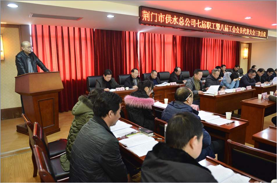 會議在莊嚴的國歌聲中開幕。公司黨委書記、總經(jīng)理陳永根作了《2016年度公司工作報告》,認真總結了2016年度取得的各項成績;供水設施建設投資體制理順、5條道路供水管道改遷提前完成、國賓酒店環(huán)評獲批;管黨治黨高度前所未有、項目建設力度規(guī)??涨啊⒐局鬏o業(yè)產(chǎn)值連續(xù)五年雙過億,總額首次突破3億元等??陀^分析了當前企業(yè)發(fā)展存在的機會和挑戰(zhàn),并對2017年度的工作作出了展望。黨委委員、工會主席馬兆芳,黨委委員、總會計師劉高軼分別作了《2016年度工會委員會工作報告》、《荊門市供水總公司2016年度財務預算執(zhí)行及2017年財務預算草案編制報告》、《荊門市供水總公司2016年度工會經(jīng)費執(zhí)行及2017年工會經(jīng)費預算情況報告》。職工代表提案審查小組組長卞軍虎對七屆職工暨八屆工會會員代表大會二次會議職工代表提案辦理情況作了報告,七屆職工暨八屆工會會員代表大會二次會議共收到34份職工提案,實際需要回復和辦理的提案為32份,已辦結的有27份,正在落實的5份,報告中對正在落實的提案進行了說明。工會副主席張春生對本次會議征集職工代表提案作了報告,本次會議共收到19份提案,其中涉及經(jīng)營管理的5份,技術改革的1份,教育培訓的1份,薪資福利待遇的12份。會議期間,與會代表給予六個報告充分肯定,圍繞各項工作報告,進行了熱烈討論,提出了許多寶貴的建議和意見。