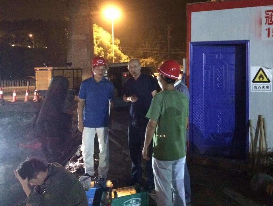 此次施工任務(wù)重、時(shí)間緊、戰(zhàn)線長(zhǎng)、交叉作業(yè)多、未知因素多,市供水總公司科學(xué)組織、準(zhǔn)備充分、措施有力,創(chuàng)造了荊門供水單次停水施工碰頭數(shù)量最多、停水時(shí)間最短的歷史紀(jì)錄!此次施工前,市供水總公司審時(shí)度勢(shì),啟動(dòng)了應(yīng)急預(yù)案,從人員、物資、設(shè)備、應(yīng)急搶險(xiǎn)等各方面都做了充分準(zhǔn)備。當(dāng)晚,公司黨委書(shū)記、總經(jīng)理陳永根親臨施工現(xiàn)場(chǎng),坐鎮(zhèn)一線指揮,要求相關(guān)部門集中力量,全力配合,爭(zhēng)取在最短的時(shí)間內(nèi)完成施工,盡快恢復(fù)供水。在爭(zhēng)分奪秒的施工過(guò)程中,全體參戰(zhàn)單位和人員在總公司領(lǐng)導(dǎo)正確指揮下,發(fā)揚(yáng)"特別能吃苦、特別能戰(zhàn)斗、特別能奉獻(xiàn)"的“供水鐵軍”精神,團(tuán)結(jié)一心,眾志成城,密切配合,群策群力,譜寫(xiě)了供水人敢與時(shí)間賽跑、敢同困難較勁的“合奏曲”。維修公司、安裝公司、營(yíng)抄中心工作人員作為搶修主力軍,在悶熱的坑洞下和污濁的泥水中實(shí)行分班作業(yè)、輪流施工,艱苦作業(yè)。職能部門管網(wǎng)運(yùn)維部、工程管理部、客服中心、水質(zhì)檢測(cè)公司積極發(fā)揮統(tǒng)籌協(xié)調(diào)能力,調(diào)度應(yīng)急供水車緊急供水、調(diào)配管材物質(zhì)、快速水質(zhì)化驗(yàn)……竭盡全力地為DN1000管道碰頭施工保駕護(hù)航。