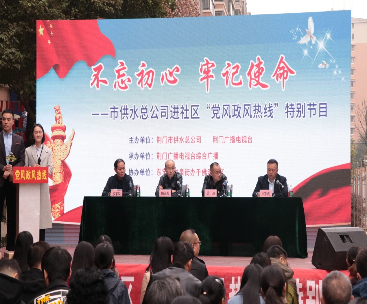 11 6日上午,由荊門市供水總公司和荊門廣播電視臺(tái)聯(lián)合舉辦的“荊門供水進(jìn)社區(qū)‘黨風(fēng)政風(fēng)熱線’特別節(jié)目”在荊門千佛洞社區(qū)舉行。市供水總公司黨委書記、總經(jīng)理陳永根帶領(lǐng)領(lǐng)導(dǎo)班子相關(guān)成員參加節(jié)目現(xiàn)場(chǎng)(網(wǎng)絡(luò))直播,圍繞“不忘初心、牢記使命”主題教育,傾聽民情民意,接受現(xiàn)場(chǎng)問(wèn)政,回應(yīng)百姓訴求,解決用戶難題。
