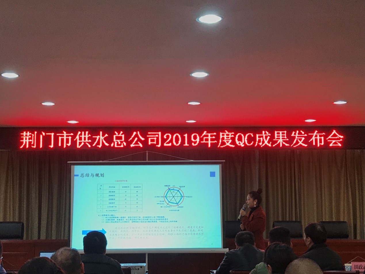 12月6日,荊門市供水總公司首屆QC成果發(fā)布會(huì)在總公司六樓會(huì)議室順利召開(kāi),質(zhì)量專家、國(guó)家級(jí)評(píng)審員劉佐光老師、荊門市質(zhì)量協(xié)會(huì)田政武秘書(shū)長(zhǎng)、公司副總經(jīng)理徐安祥及各部門主要負(fù)責(zé)人參加了發(fā)布會(huì),會(huì)議由QC工作組組長(zhǎng)劉昕平主持。